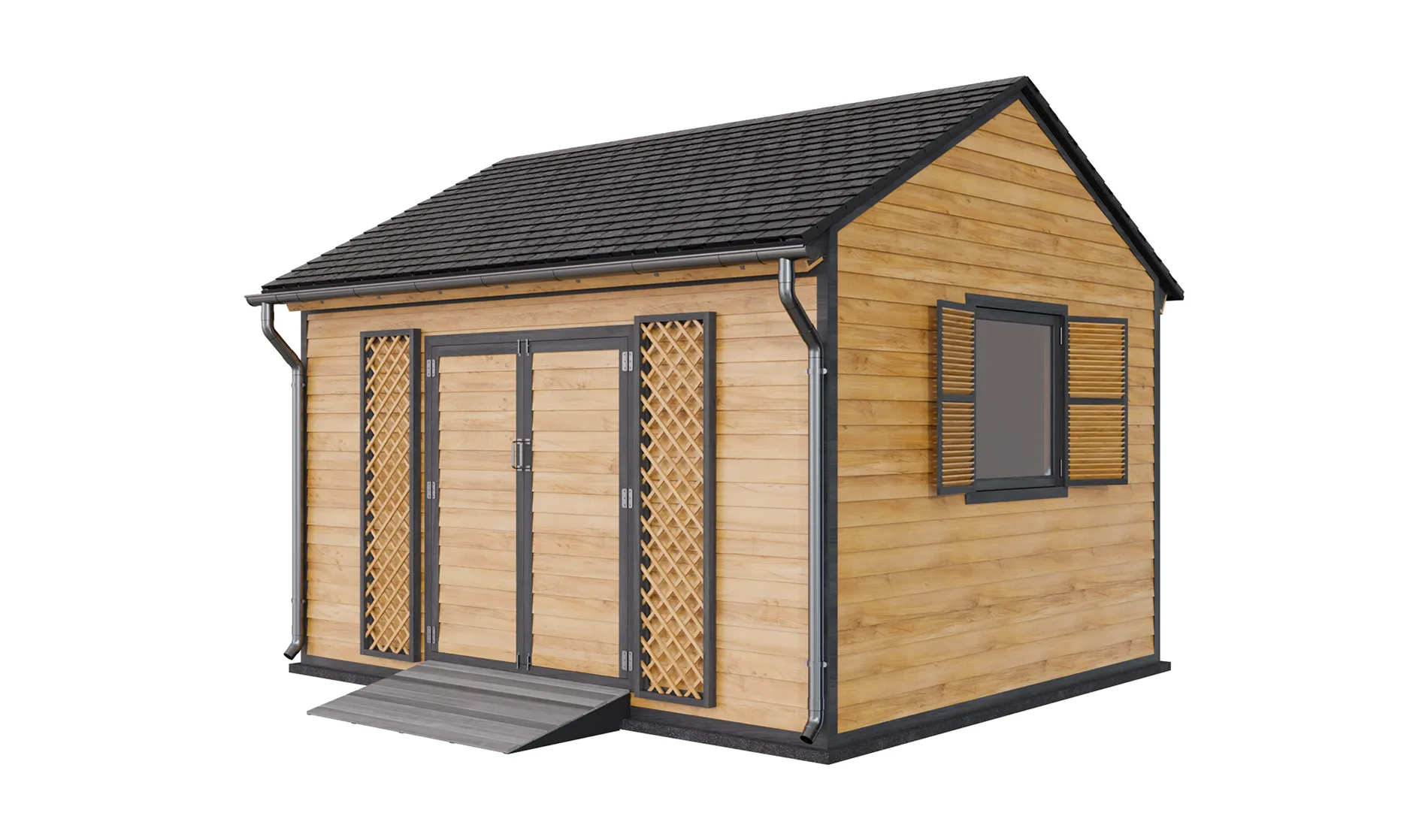 A wide double 64-inch door allows you to move tools easily in and out of the shed. The 5 feet width ramp at the foot of the door makes it easier to bring in or take out wheeled and heavy devices.